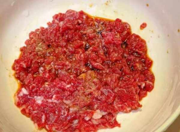 2:牛里脊肉提前洗净。牛肉要先切成几片薄片,切成几片纤维状或肉末,将切好的牛肉放入容器中,碗中加入半勺料酒,撒上盐和胡椒粉,切记一定要.如果加得太多,让碎牛肉均匀吸收。