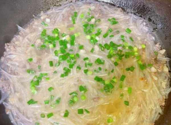 6:撒上葱花,起锅,这道白萝卜丝肉末汤就做好了。汤汁鲜美,营养丰富,味道鲜美。