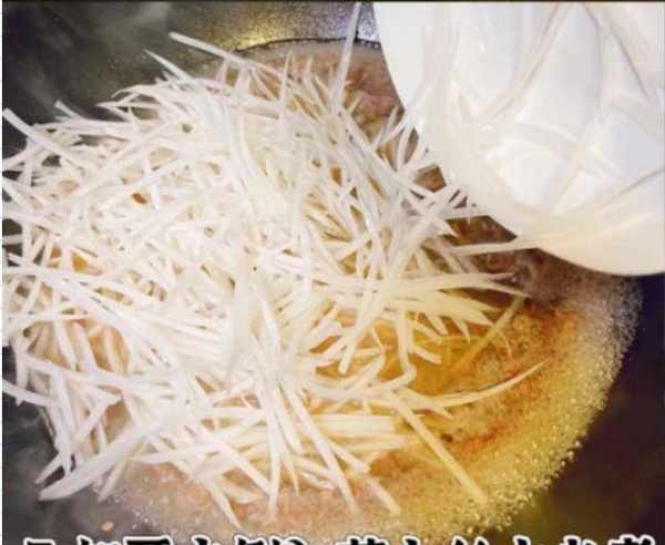 4:倒入腌制好的肉末,大火炒至变色,也可以加入少许料酒和生抽,快速炒熟后倒入1000毫升开水。