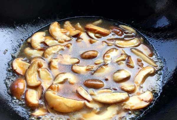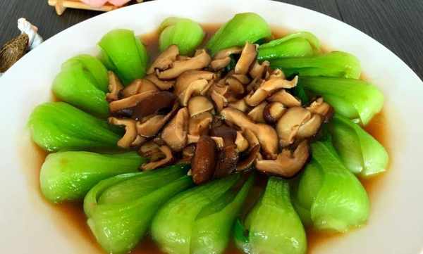 3.另取一锅,倒少许油,加入葱姜蒜爆香,倒入香菇片大火翻炒1分钟,香菇后加入适量盐和蚝油炒匀-蘑菇片煮熟,摊开,放在油菜籽中央。锅内汤汁加水淀粉勾芡,文火熬至浓稠,淋在香菇和菜籽上。