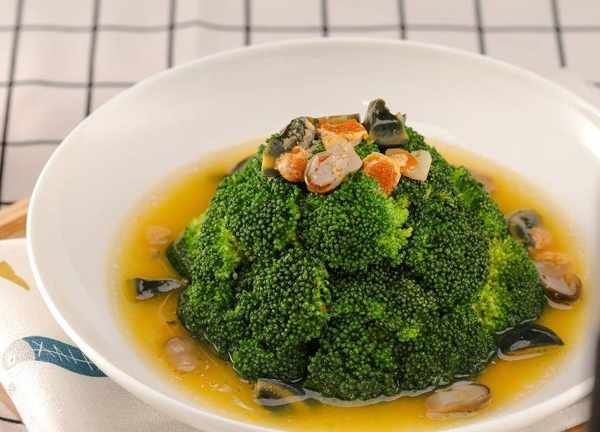 3、另起一锅,加入适量食用油烧热,加入蒜片爆香,加入皮蛋和咸鸭蛋,小火炒香,倒入西兰花和香菇,炒香-炒2分钟,加入适量鸡精、盐,炒匀,加半碗水,小火煮3分钟。取出西兰花放在盘子里,把汤倒在上面。