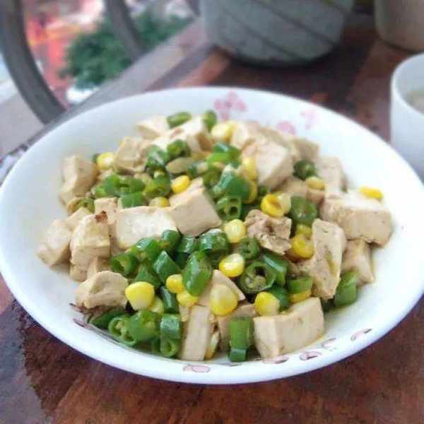 辣椒200g、玉米200g、嫩豆腐300g、油适量、宴友食用油、蒜适量、生抽适量、水淀粉适量、盐适量