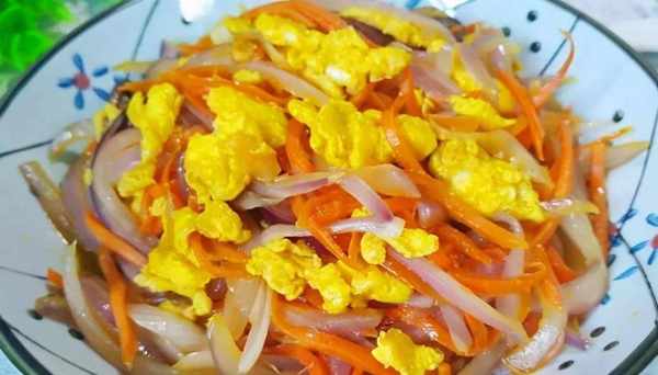 2 胡萝卜和洋葱切丝,鸡蛋打散备用,姜蒜切末。