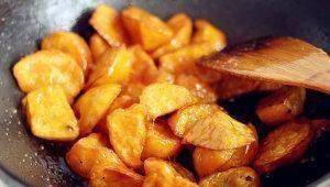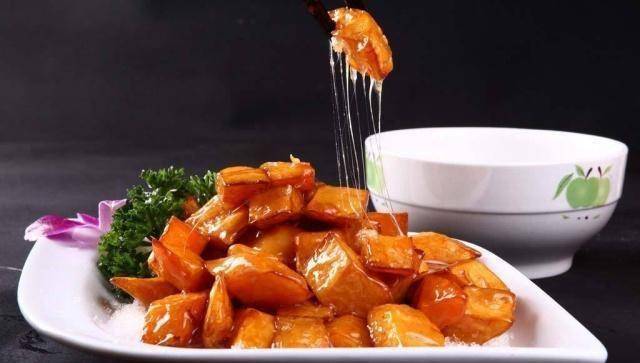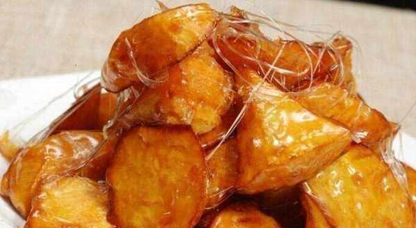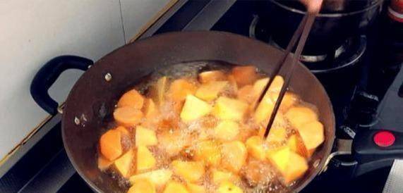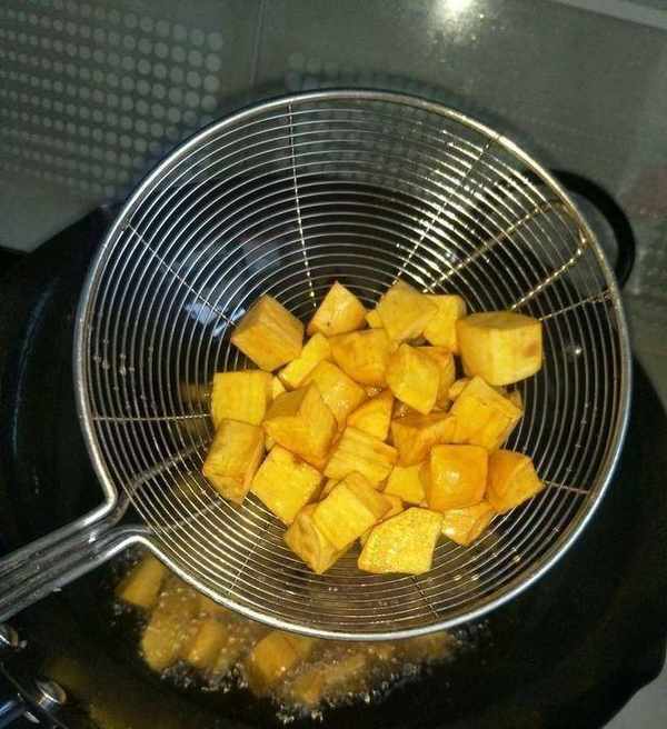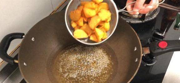 炒糖浆的时候,一定要等锅里的白泡泡没有了,再放红薯块,这样糖就容易碎了。当心!
