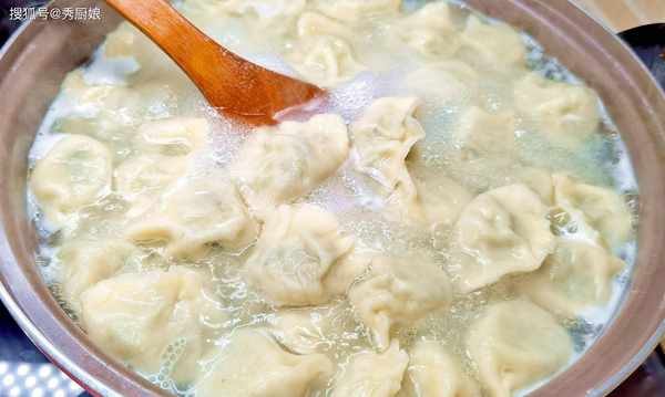 4.锅内加水烧开,放入饺子,煮十几秒后,用铲子沿着锅边推动几下,防止粘锅底,大火煮开后,加点凉水,再煮开,再加半碗清水,第三次煮开后,饺子就可以出锅了。