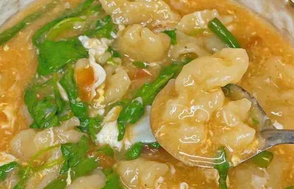 ③面粉和水调成小块倒入锅中(边倒边搅拌)