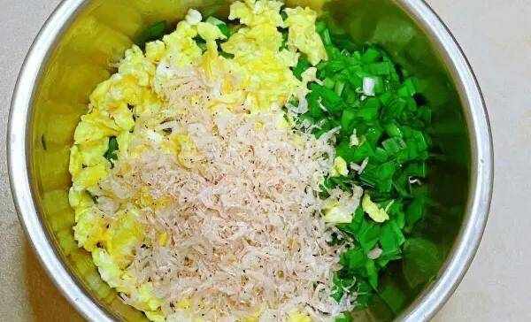 利用这个时间,咱们把新鲜的韭菜清洗干净,控干水分,切成碎末,然后放点香油拌一拌,封住韭菜的刀口,这样韭菜才不出水,然后再往韭菜里面,直接打上两个鸡蛋,抓上一把虾皮,放适量的盐鸡精味精搅拌均匀调味,