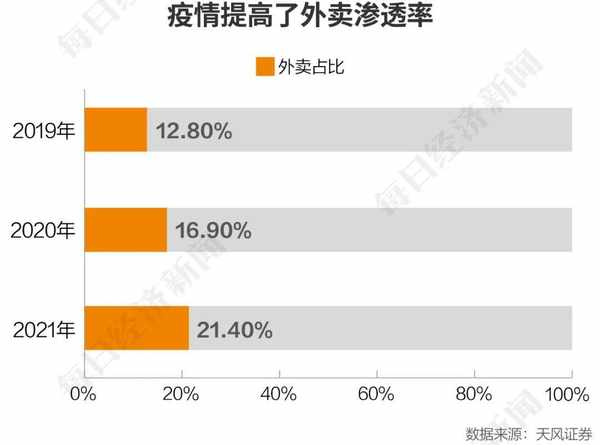 但无论如何,疫情确实大大提高了外卖渗透率。天风证券研报称,2019年外卖收入占全国餐饮业收入比例为12.8%,2020年迅速提升至16.9%,2021年这一比例又上升至21.4%。
