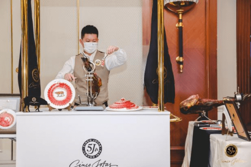作为时光与自然带来的美味艺术,5J火腿使用世代相传的传统工艺,在百年火腿窖中匠心打造,每一条5J火腿至少经历5年的自然过程,以呈现出浓郁坚果香气及丰富味觉层次。不论是发布会现场还是晚宴,凝聚西班牙风味的5J火腿均为在场宾客留下了深刻印象。