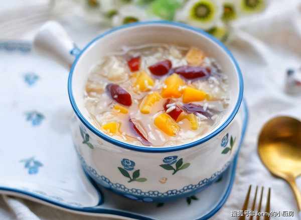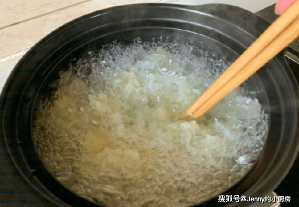 处理好了倒进砂锅内,加入适量清水熬煮,小火煮到银耳出胶。