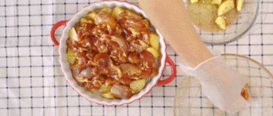 将土豆铺在烤盘的底层,鸡腿肉铺在上层...(就是这么简单,是不是有点小激动呢...)