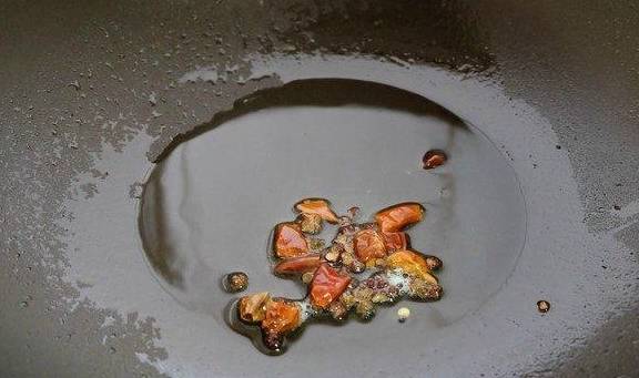 4、炒锅上火烧热,放食用油,我这里放的是玉米油,油温后把干红辣椒和花椒放进去,小火炸香;注意别把火调太大,油温也不要太热,否则辣椒进去就炸黑了,影响口感;
