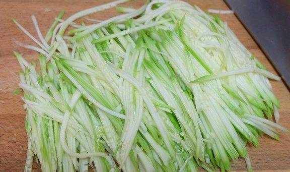 2、用刀把西葫芦切成细丝,如果不想切,用擦丝器擦也是可以的,不过个人觉得手工切的更好看也更好吃一些,切的越细越好,切好以后码入盘中;