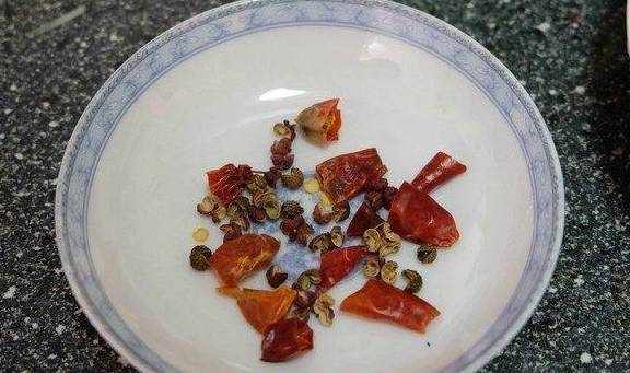 3、准备干红辣椒和花椒,辣椒多少根据自己想要的辣味决定;