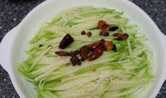 7、把调味汁浇在西葫芦丝上,挑去花椒粒,调拌均匀即可食用;