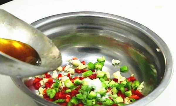 4.趁着这个时间,我们调一个料汁:大蒜拍扁切成末,青、红椒切成小粒用来配色,全部放在一起,加入食盐2克、香油5克、辣椒红油5克、生抽5克、用筷子搅拌均匀。