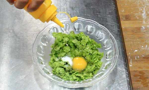2.鲜榆钱用清水洗干净,控干水分放入盆中,先拌一层香油省的出水,然后加入葱花、食盐、打入一个鸡蛋拌匀做馅。