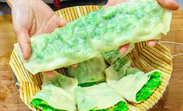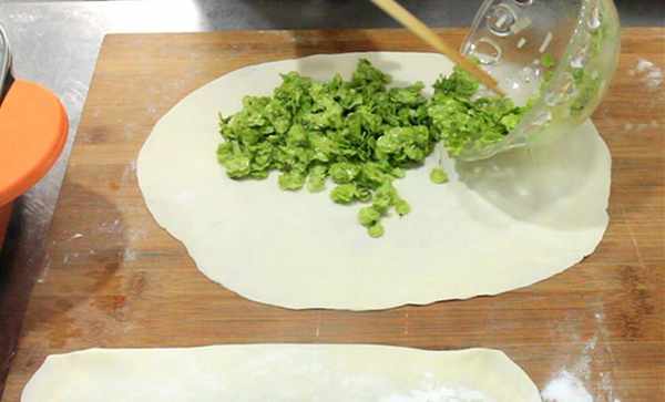3.面团饧好以后揉光滑、搓成条、揪成一样的面剂子,把面剂子揉圆、擀成薄面片,铺上榆钱馅,卷成菜蟒的形状,把边缘压紧,一个一个全部做好,就能开始蒸了。