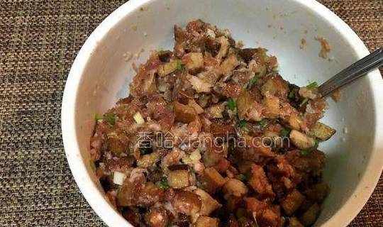4.面团发酵时,准备肉馅,猪肉洗净剁成末,香干洗净切成小丁,加入盐、生抽、蒸鱼豉油、鸡精、香葱搅拌均匀后备用
