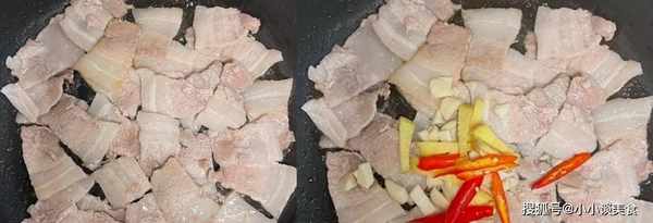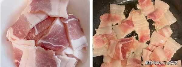 第四步:锅底放橄榄油,将五花肉平铺在锅底,小火慢炒,快炸去油,待颜色变白。