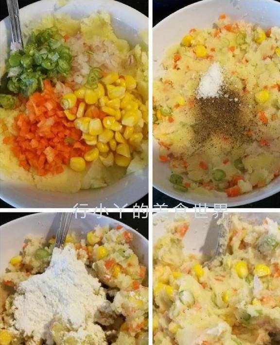 2.制作饼胚。各色材料切丁(我用了四季豆调色,这个需要先焯水),土豆去皮,并用勺背压成土豆泥,加入各色菜丁,加入盐和花椒面,混合均匀。根据需要加入适量面粉,搅拌成软硬适中的混合物(若太湿可加些面粉,尽量不要加水,菜品会出水,因此加水要慎重!)