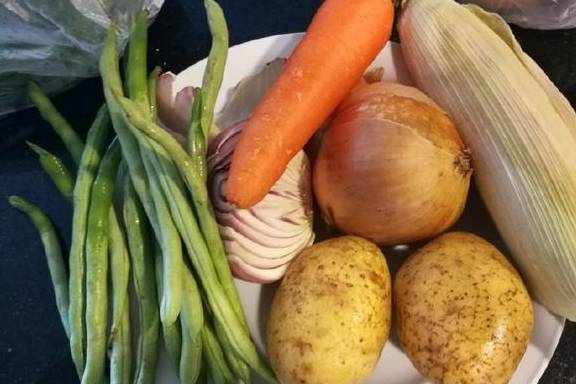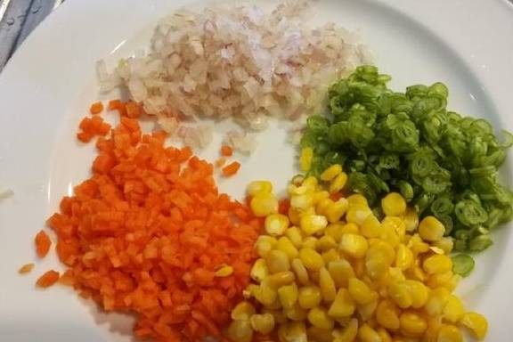 1.备菜。玉米煮熟、四季豆焯水(有葱的话一定用葱噢);土豆放蒸锅里蒸熟(我用的微波炉,用微波炉最好是用有盖容器,容器内加少量水并加盖蒸,用蒸锅蒸最好啦!)