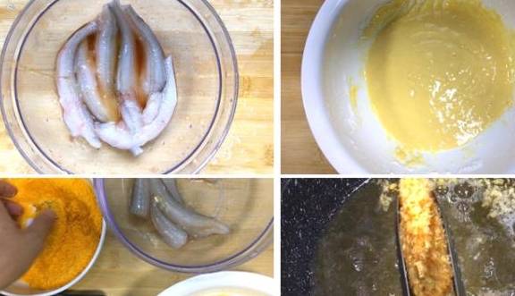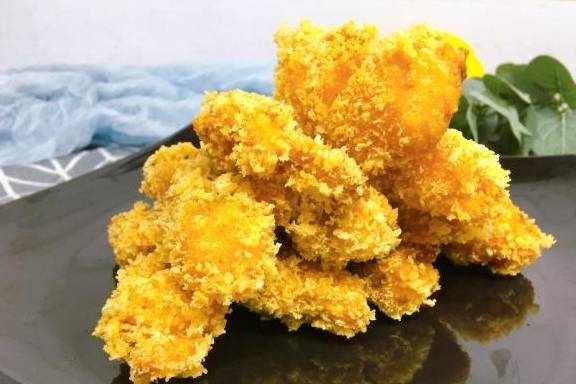 3.九肚鱼放入面糊中,裹上一层面糊,再裹上一层面包糠,放入油锅里炸至表皮酥脆金黄捞出。