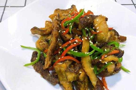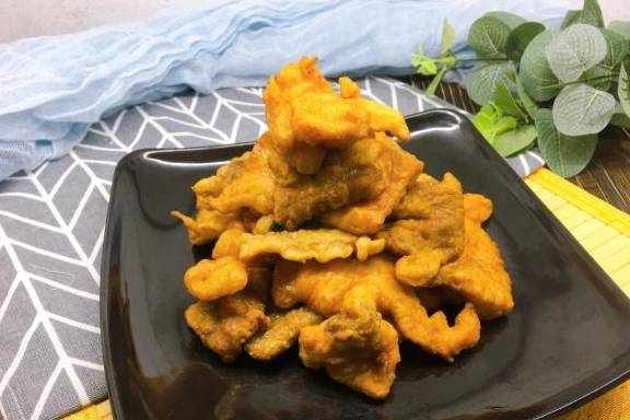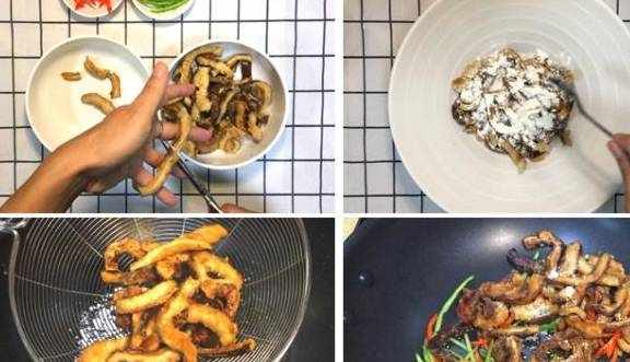 4.把油温提升到6成热,再炸一次九肚鱼10秒后捞出即可。