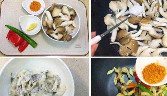 6.起锅把青红椒炒断生后加入平菇撒上椒盐翻炒均匀即可。