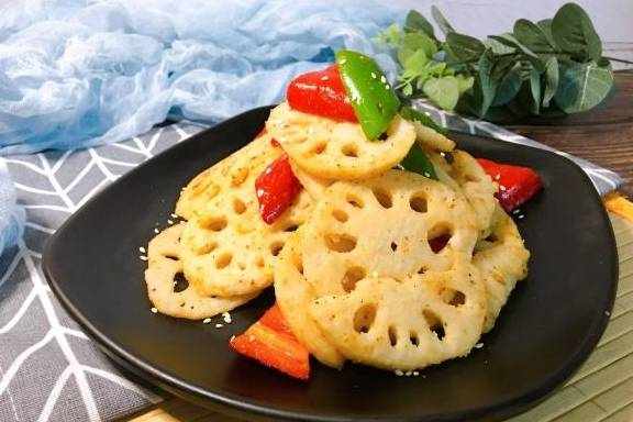 4.热锅把青红椒炒断生,加入炸好的藕片,一边炒一边撒入椒盐、芝麻即可。