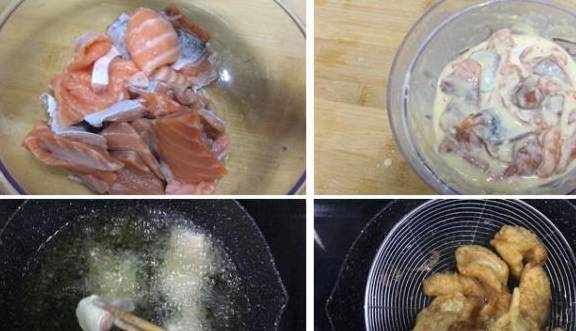 3.热锅烧油把三文鱼炸至表面金黄后捞出,把油温提升到6成热再把三文鱼炸10秒捞出即可。