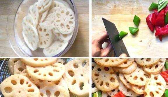 1.选大节莲藕,去皮切成厚片,清水浸泡。青红椒切角片。