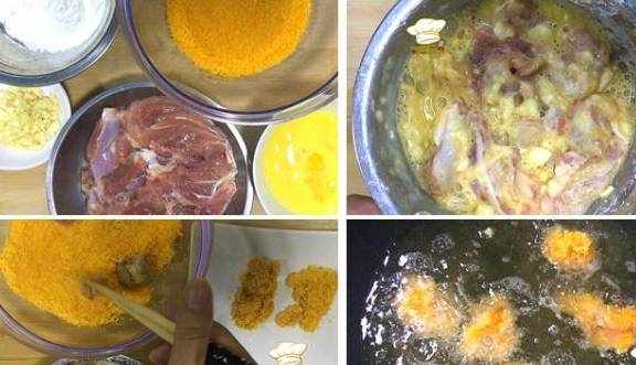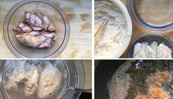 3.依次取鸡腿肉粘上面包糠放入油锅里炸至金黄捞出。