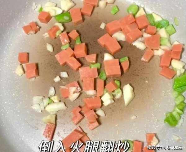 第五步:将切碎的火腿放入锅中,快速翻炒片刻,加入几大碗水,盖上锅盖大火煮熟,加入一些豆腐块继续煮几分钟。