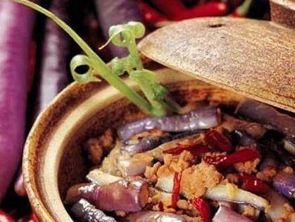 3.在原锅里加肉末炒到变色,加葱花、姜末、辣椒油,炒匀后调入鸡精、料酒、酱油和醋,再加入茄条和汤(或清水),焖至酥烂。