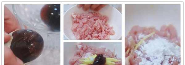 皮蛋洗净后剥皮备用,今天做得不多,小美只用了3个皮蛋。一块瘦肉切成细丝,再改刀剁成肉丁,放入小碗中准备腌制。一块生姜切丝,放入肉碗中,加入少许料酒祛除肉的腥味。再加入少许鸡精和蚝油、生抽调个味。在这里小美教大家一个小技巧,在腌制肉类的时候,为了保持肉的弹性,我们可以加入少许淀粉保证肉不会变柴。