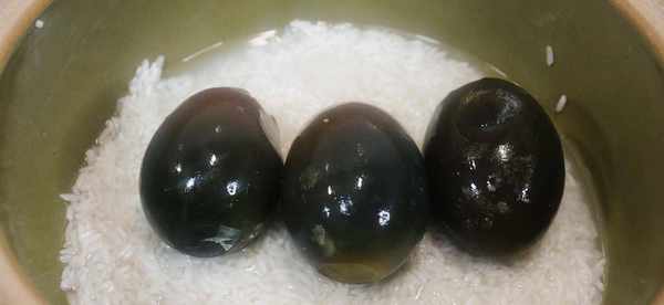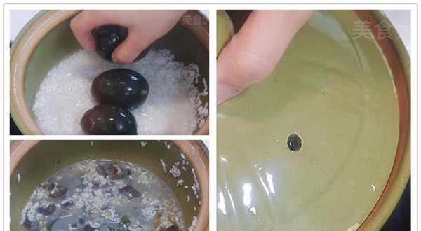 大米泡水半天,这个也可以不泡。把泡好的大米倒入砂锅中,铺满底部后,先别加水把皮蛋放进去,戴一次性手套下去将皮蛋抓散。把皮蛋全部抓散,均匀躺在大米上,皮蛋发出的香味这个时候特别令人流口水。最后加入大碗大碗水,盖上盖子开始熬粥。
