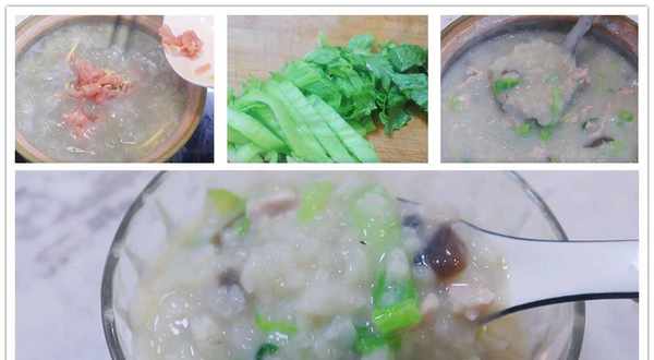 先大火沸煮10分钟,再转中小火继续熬粥15分钟左右。就可以开盖来下肉了,猪肉下入跟米粥一起熬煮,边下肉边搅拌。肉已经腌制好了,气质够所以熬煮这锅粥基本不用下调料。小美还喜欢在里面加入一把青菜,这样的出来的皮蛋粥颜色更丰富,气质更特别。