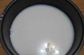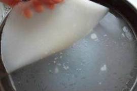 7、用大点的锅烧一锅开水,把装好糊糊的盘放入开水锅中,盖上锅盖,火要一直保持大火,看到糊糊在锅里起大泡泡的时候,取出来,放入冷水中冰凉。