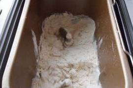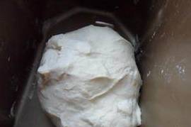 1、面粉加入清水揉成光滑的面团,面团要多揉一会,做出的凉皮才会劲道,面团的硬度就如同我们平时包饺子一样就行(有了面包机,当然不需要我亲自动手了,把面粉和清水放入面包桶里,按揉面的程序,看着面包桶里的两只小手忙忙碌碌的,真是快乐啊!)。