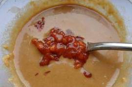 11、把大蒜捣成蒜泥,放入生抽、香醋、花生酱、盐、辣椒酱调成酱汁,浇在步骤10的盘子里调好就行了。