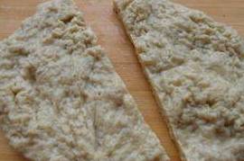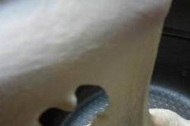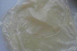 6、准备一个做凉皮的用具,我用的是家里的9寸披萨盘和六寸的派盘轮换着用,盘底抹上一层油,舀上一勺糊糊(糊糊的多少由个人掌握,喜欢厚一点儿的就多舀一点儿,反之则少一些),然后用手转一转,让糊糊均匀的铺满盘底。