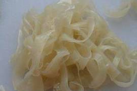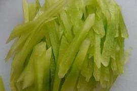 10、把莴苣切丝、凉皮切成自己喜欢的宽度,和面筋块一起放入盘子里。
