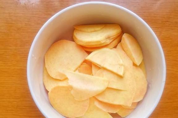 2、接着把红薯洗干净去皮,然后切成片状,送入锅中,隔水蒸熟