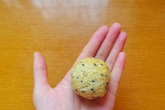 4、然后取适量混合好的食材,用手搓圆,大家搓的时候,手掌心一定要拍点水,可以防粘。