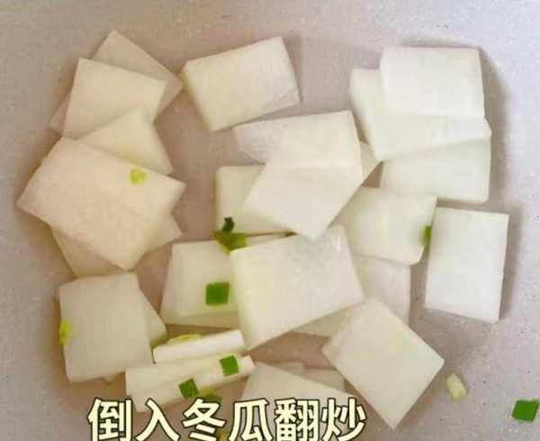 第五步:加入一些冬瓜,稍微炒一下,加入两大杯水,把汤烧开,转小火继续煮。