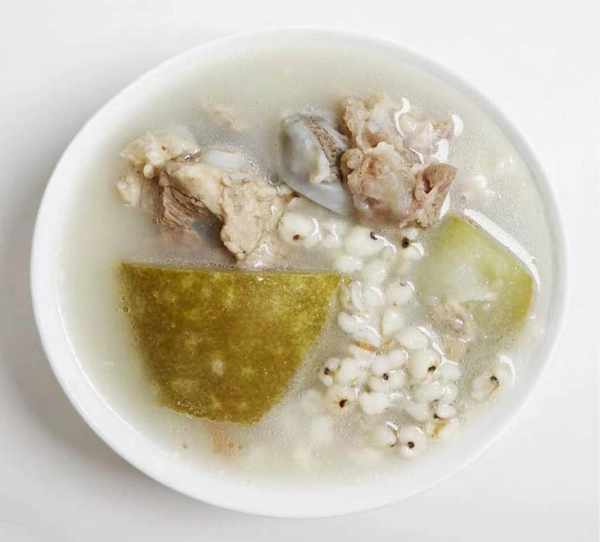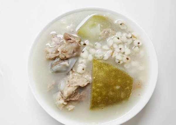 原料采购:买猪骨500克(猪骨是夏季炖汤的首选,骨头的钙、锌含量很高,骨头汤的营养都在汤里,炖出来的汤很好喝的猪骨汤肉很少营养在骨头里猪骨需要提前焯水去腥味),买一小碗薏米,1400毫升水,两碗温开水、蜜枣数粒、姜少许、冬瓜300克、香油几滴、葱少许、烧酒少许、盐一小勺、鸡汤半勺、胡椒粉少许,和其他香料。