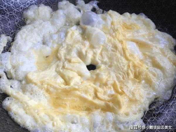 第六步制作:加入几粒鸡蛋,待两种材料炒匀后,加入少许葱花,少许鸡精,炸好后装盘。