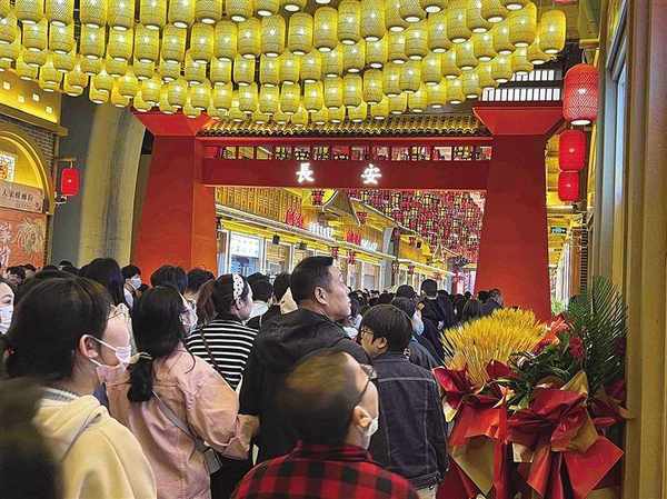 这家新开街的黄河食渡美食文化夜市,位于元通黄河大桥北引桥下与靖远路交汇处,与黄河仅一路之隔,是兰州市首家集“食、游、购、娱、体、展、演”等多元化消费体验的主题街区。“过年时刚去过西安的‘长安十二时辰’,很热闹很新颖,没想到兰州现在也有了自己的‘金城十二时辰’。”开市第一天就带着孩子去逛夜市的市民魏先生一边寻找美食,一边拍视频自己抖音和朋友圈。