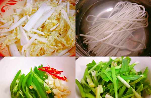 1,适量的娃娃菜清洗干净,切成粗条,装盆备用。少许韭菜根部摘洗干净,切成段,装碗备用。两个青椒洗净,去籽后切成粗丝,两个小米椒洗净切丝,两瓣蒜去皮洗净切丁,适量的生姜去皮切丁,一起装入碗中,半袋火锅粉条放入小锅中,清洗两遍后凉水浸泡着。